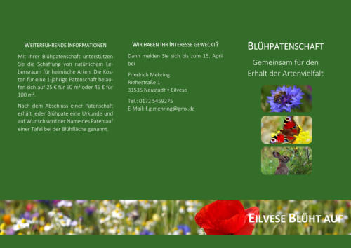 Gemeinsam mit den Eilveser Bürgern startet Friedrich Mehring eine Aktion zum Erhalt der Artenvielfalt. Bienen, Schmetterlinge und andere Insekten haben es in unserer technisierten Zeit schwer. Mit einer Patenschaft können die Eilveser einen Beitrag für unser aller Umwelt leisten. Weitere Informationen erhalten alle Eilveser in Kürze mit diesem Flyer oder laden ihn hier herunter. Anfragen per mail: f.g.mehring@gmx.de oder 0172/5459275